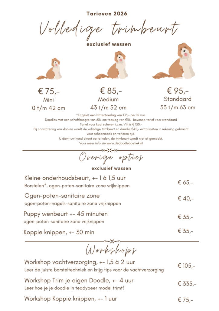 • Betaling dient ter plaatse te geschieden of in ieder geval binnen 24 uur na behandeling van de hond. Wanneer dit niet het geval is behoudt De Doodle Boetiek zich het recht voor om vervolgafspraken te annuleren en eventuele procedurele kosten te verhalen op de klant.